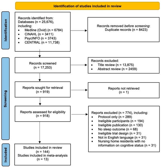 The following databases were searched from inception to 3 October 2023: Medline (Ovid), CINAHL, PsycINFO, and the Cochrane CENTRAL database. This was the date finalised in the published protocol []. The detailed search strategy for each database is reported in the protocol and summarised in Supplementary Materials (Table S1) []. Broadly, the search strategy involved the following Boolean expression: ‘sleep’ (plus synonymous terms) AND ‘[cognitive impairment (plus synonymous terms) OR nursing home resident (plus synonymous terms)]’ AND ‘clinical trial’. The interTASC Information Specialists Sub-Group (ISSG) Search Filter Resource was used to filter for clinical trials []. Given the high prevalence of cognitive impairment among nursing home residents [,], it was felt prudent to include ‘nursing home resident’ (and synonymous terms) with ‘cognitive impairment’ (and synonymous terms) in order to ensure the capture of trials conducted in nursing homes that did not explicitly reference participants’ cognitive diagnoses but may nevertheless meet our inclusion criteria by reporting cognitive assessment scores. To illustrate this point, in a 2018 systematic review of non-pharmacological interventions to improve night-time sleep among residents of long-term care settings [], over half of included studies involved participants with dementia but this was not always explicitly stated in the studies themselves []. The search strategy was reviewed in accordance with the Peer Review of Electronic Search Strategies (PRESS) Guideline Statement [].
