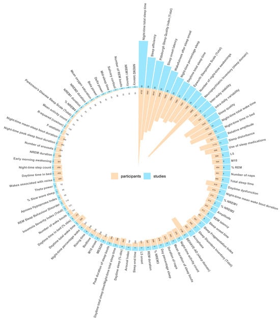 In total, across the 144 included trials, 287 discrete sleep outcome measures were reported. Of these outcomes, 205 appeared in only one trial, while a further 23 appeared in only two trials. Figure 3 presents the sleep outcome measures that were reported in more than one trial (n = 82) and illustrates the number of trials in which each sleep outcome measure was reported with the total number of participants involved in those trials. The complete data, including data pertaining to the 205 outcome measures that appeared in only one trial, are provided in the Supplementary Materials in Table S4 and graphically in Figure S2.
