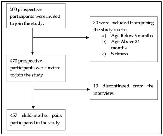 The sample size was determined using the Kothari formula []: n = [(Z2 × P(1 − P))/d2]; here, P was the estimated prevalence of aflatoxin exposure (72%) among children under 36 months in Haydom, Mbulu District, Manyara region []. The sample size calculation used a 95% confidence level (Z = 1.96), 4% absolute precision (d = 0.04), and 80% statistical power. Based on these parameters, a sample size of 485 participants was proposed. Ultimately, 457 mother–child pairs participated in the study (Figure 1). In cases where a mother had more than one child aged 6–24 months, one child was randomly selected.