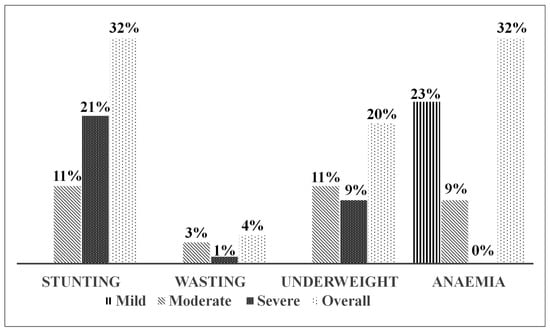 The findings from this study indicate that 32%, 4%, 20% and 32% of children aged 6–24 months were stunted, wasted, underweight and anaemic, respectively. Figure 2 presents the distribution of overall, mild, moderate and severe forms of these conditions.