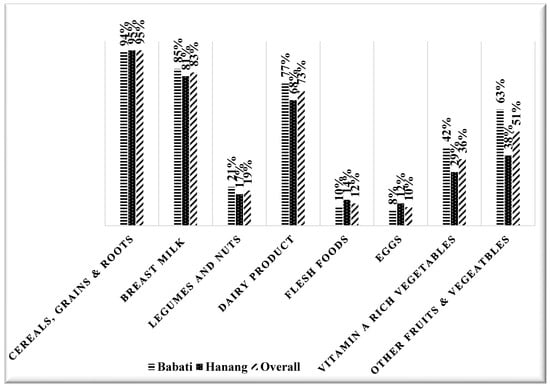 The mothers and caregivers of children aged 6–24 months responded to a validated food frequency questionnaire (FFQ) []. From these, the child’s dietary diversity was calculated by assessing the intake of eight food groups in the past 24 h based on WHO guidelines []. The eight food groups included Group 1: Cereal, grain, roots, and tubers; Group 2: Breast milk; Group 3: Legumes and nuts; Group 4: Dairy products; Group 5: Flesh foods; Group 6: Eggs; Group 7: Vitamin A-rich fruits and vegetables; and Group 8: fruits and vegetables. For example, when a mother reported giving the child porridge made of maize flour or sorghum in the past 24 h, the consumed food was placed in group 1, or when a mother gave her child cow’s milk, this response was placed in group 4. Thereafter, adequate minimum dietary diversity was attained if a child consumed five or more groups out of the eight food groups and inadequate dietary diversity was attained if a child consumed below five food groups [].