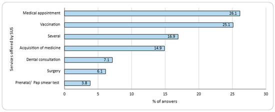 The main clinical conditions reported by participants were hypertension (27.0%), anxiety (22.7%), dyslipidemia and diabetes mellitus (both conditions; 10.5%). However, 35.0% of participants stated they did not have any clinical conditions, and 31.5% had more than one condition. Among the responses, medical consultations were the most used SUS service (26.1%), followed by vaccinations (25.1%) and medications (16.9%), as shown in Figure 1. Among the main difficulties reported regarding medication use, the most notable were forgetfulness (22.3%), acquisition (17.0%), and polypharmacy (12.1%). Additionally, 5.3% of participants reported difficulties involving the need to avoid alcohol during a specific pharmacological treatment.