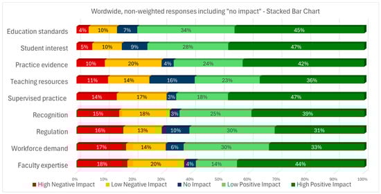 Non-weighted, worldwide results, including “no impact” answers, for the factors positively or negatively impacting the education of occupational therapists for practice in mental health.