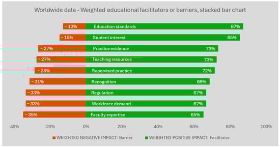 Worldwide results for the weighted barriers or facilitators for the education of occupational therapists in mental health. Legend: Factors were weighted, ranked, and then translated into 100% stacked bars. The values reflect a differential weight for the magnitude of the response direction (i.e., high negative impact answers count double the value of ‘low negative’ responses for the red bar; ‘high positive’ impact answers count double the value of ‘low positive’ responses for the green bar). The weighted results were then ranked, from the most positive to the most negative influence. The weighted, ranked results were translated into 100%-stack bars (i.e., sum of the red and green bar for the same item = 100%). The full description is available on Table 1.