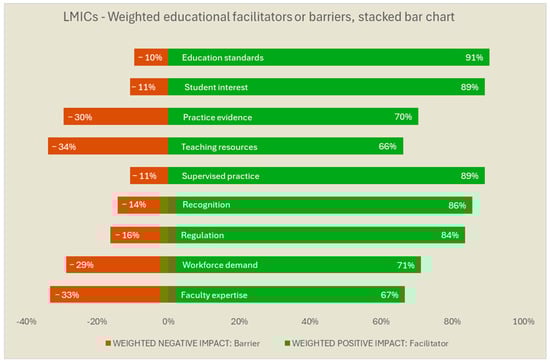 Low and Middle-Income Countries’ (LMICs) weighted barriers and facilitators for the education of occupational therapists in mental health. Legend: The weighted values reflect a differential weight for the magnitude of the response direction (i.e., high negative impact answers count double the value of ‘low negative’ responses for the red bar; ‘high positive’ impact answers count double the value of ‘low positive’ responses for the green bar). The weighted results were ranked in the same order of the non-stratified results, for comparative purposes among countries of varied income levels. The weighted results were translated into 100%-stack bars (i.e., sum of the red and green bar for the same item = 100%) for easier interpretation. The full description is available in Table 1.