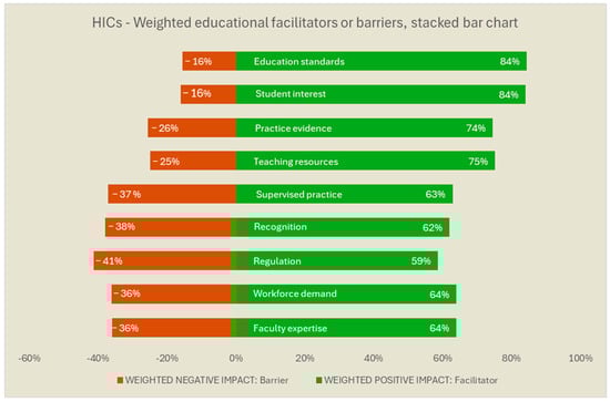 High-Income Countries’ (HICs) weighted barriers and facilitators for the education of occupational therapists in mental health. Legend: The weighted values reflect a differential weight for the magnitude of the response direction (i.e., high negative impact answers count double the value of ‘low negative’ responses for the red bar; ‘high positive’ impact answers count double the value of ‘low positive’ responses for the green bar). The weighted results were ranked in the same order of the non-stratified results, for comparative purposes among countries of varied income levels. The weighted results were translated into 100%-stack bars (i.e., sum of the red and green bar for the same item = 100%) for easier interpretation. The full description is available in Table 1.