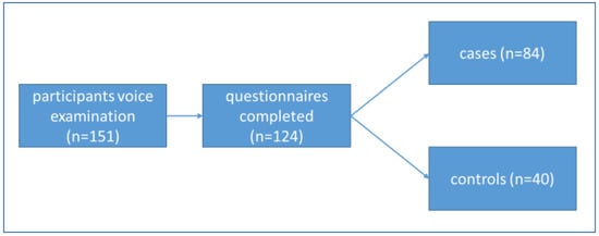 The 124 participants with complete data sets were divided into cases (n = 84) and controls (n = 40). Participants were assigned to the cases group if they had at least one clinically significant finding in any of the following three diagnostic measures: (a) Voice Handicap Index (VHI; severity level 1 or higher), (b) video laryngoscopy (VLS), or (c) roughness, breathiness, and hoarseness scale (RBH) (R1B0H1 or R0B1H1 or higher). All other participants were assigned to the control group.