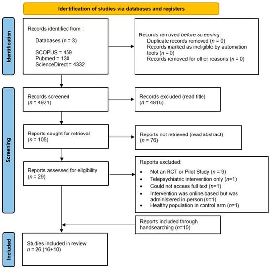 Two authors (P.A., N.S.) accessed the eligibility of all 4921 hits and excluded 4816 based on title, leaving 105 abstracts. Then, the same two authors screened these abstracts independently for eligibility, excluding ineligible records (n = 76). The remaining 29 articles were collected for detailed evaluation based on inclusion and exclusion criteria, with 13 being excluded, and 16 being included. The reasons for exclusion are detailed in Figure 1. Additionally, 10 papers were collected and included after a hand search of references from the selected papers was conducted. The final count for included studies was 26. In cases of discrepancy concerning the decisions made between the reviewers, the papers were discussed until a consensus was reached with the support of J.A. Figure 1 outlines the search process of the literature, according to PRISMA [].