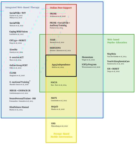 Diagram depicting the overlap of the different intervention types across studies. Abbreviations: TCT (Targeted Cognitive Training), MOBIT (Mobile interaction with a web-based program), CLIMB (Creating Live Interactions to Mitigate Barriers), MRIGE (Mind Reading: Interactive Guide to Emotions), COGPACK CR (Computerized Cognitive Remediation), NPT-MH (NeuroPersonalTrainer-Mental Health), PRIME (Personalized real-time Intervention for Motivational Enhancement), SOAR (Schizophrenia Online Access to Resources), MATS (Mobile Assessment and Treatment for Schizophrenia), SM (Self-Monitoring). References: Nahum et al., 2021 []; Fisher et al., 2017 [], Miley et al., 2020 [], Gottlieb et al., 2017 [], Depp et al., 2019 [], Özer et al., 2024 [], Ellet et al., 2022 [], Biagianti et al., 2016 [], Maroño Souto et al., 2018 [], Lindenmayer et al., 2012 [], Fernandez-Gonzalo et al., 2015 [], Moritz et al., 2015 [], Schlosser et al., 2018 [], Fisher et al., 2023 [], Rotondi et al., 2010 [], Alvarez Jimenez et al., 2021 [], Kidd et al., 2019 [], Ben-Zeev et al., 2014 [], Granholm et al., 2012 [], Moritz et al., 2016 [], Pjinenborg et al., 2010 [], Vitger et al., 2022 [], Westermann et al., 2020 [], Van der Krieke et al., 2013 [], Steinwachs et al., 2011 [], Depp et al., 2019 [].