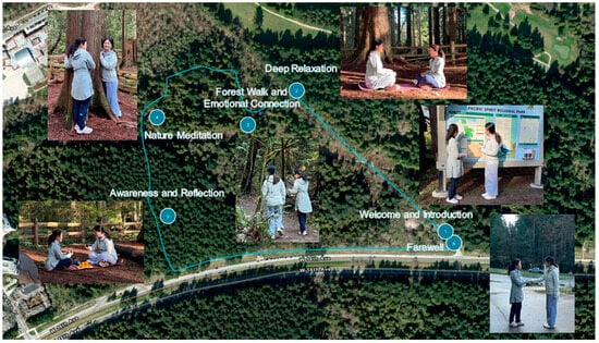 The guide led participants along pre-planned routes and designated locations for therapeutic activities (Figure 1, Table 3), providing emotional support and guidance on relaxation techniques throughout the session.