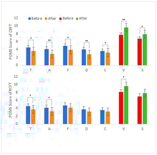 Figure 3. POMS results of the participants before and after the FT programs. Note: T: tension–anxiety; D: depression–dejection; A: anger–hostility; F: fatigue–inertia; C: confusion–bewilderment; V: vigor; S: self-esteem. Significant differences are marked with * p < 0.05 and ** p < 0.01.
