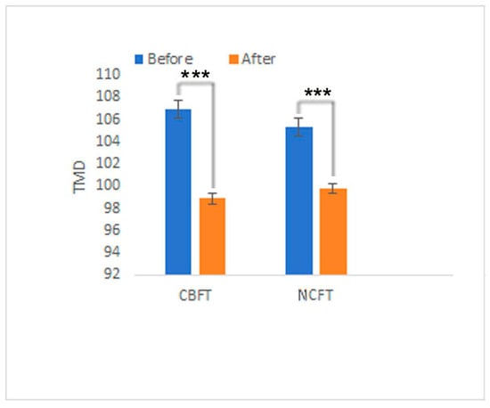 Figure 4. The TMD scores of the participants before and after the FT programs. Note: Significant differences are marked with *** p < 0.005.