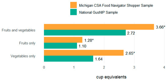 Comparisons with National Sample Mean Fruit and Vegetable Consumption. Note: Ordinal frequency responses to the 10-item Dietary Screener Questionnaire (DSQ) were converted to cup equivalents of fruits and vegetables. Michigan CSA Food Navigator Shopper Sample (n = 80–81). National GusNIP sample (n = 7689–7851). * Indicates that mean cup equivalents consumed by Michigan SNAP-eligible shoppers was significantly different from the national mean, based on a one-sample t-test.