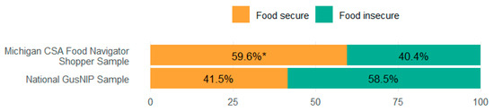 Comparison with National Sample Food Security Status. Note: Responses to the 6-item USDA Food Security Status module were dichotomized into “food secure” (0–1) and “food insecure” (2–6). Michigan CSA Food Navigator Shopper Sample (n = 99). National GusNIP sample (n = 5838). * Indicates that proportion of food secure individuals in the Michigan SNAP-eligible shoppers’ sample was significantly different from the national sample, based on Chi-square test.