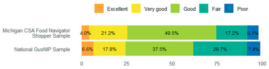 Comparison with National Sample Self-Rated General Health. Note: Survey question: Would you say that in general your health is poor, fair, good, very good, or excellent? Michigan CSA Food Navigator Shopper Sample (n = 99). National GusNIP sample (n = 5445). No significant changes were found.