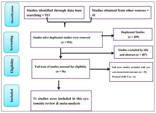 The initial search yielded 952 studies from databases and grey literature sources. After removing 409 duplicates, 543 studies remained. These were screened by title and abstract, resulting in the exclusion of 487 studies. The full texts of the remaining 56 studies were then assessed for eligibility [2,6,8,9,10,11,12,16,26,27,28,29,30,31,32,33,34,35,36,37,38,39,40,41,42,43,44,45,46,47,48,49,50,51,52,53,54,55,56,57,58,59,60,61,62,63,64,65,66,67,68,69,70,71,72,73]. Of the 56 full-text studies assessed, 39 were excluded due to inconsistent results and study designs, and 6 were study protocol-only. Ultimately, 11 studies met the inclusion criteria and were included in the final systematic review and meta-analysis [2,6,8,10,11,12,16,27,28,29,30] (see details in Figure 1).