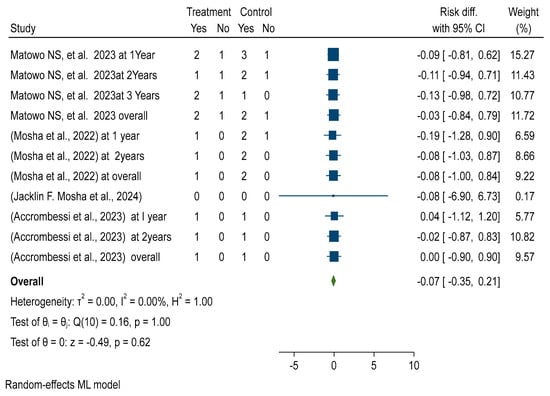 Forest plots showed that malaria infection risk reduction among children using the pyriproxyfen intervention group versus pyrethroid-only long-lasting insecticidal nets (LLINs) standard treatment revealed no significant difference (RR = −0.00 with 95% CI −0.04, 0.03). Figure 1 reveals that there is no significant difference in malaria prevalence reduction between the treatment and control groups. Furthermore, the included studies were homogeneous, with an I2 of 0.00. See details in Figure 2.