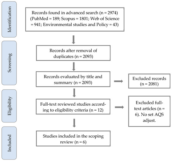 Our initial search identified a total of 2974 articles, but 2093 documents remained after the removal of duplicates. Following the titles and abstracts screening, 2081 papers were excluded, leaving 12 articles for full-text evaluation as shown in the flow chart (Figure 1). A subset of six studies met the eligibility criteria and were included in the final review. The main exclusion reason for these studies was the lack of a clear proposal for AQS adjustment.