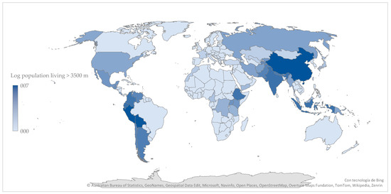 Global estimates and distributions of altitude populations have shown considerable variability over time. Earlier approaches primarily relied on inconsistent population records and incomplete country-level data [65]. In contrast, recent studies have integrated georeferenced population estimates with elevation datasets to generate refined global and national-level assessments of human populations residing at various altitudes [27]. According to these estimates, approximately 500 million people live above 1500 m, 81 million above 2500 m, and 14 million above 3500 m. The latter group is represented in Figure 2, which illustrates their distribution using a log10 scale to enhance visual contrast and highlight inter-country differences. Nearly 90% of this population resides in just three countries: China, Peru, and Bolivia, in that order.
