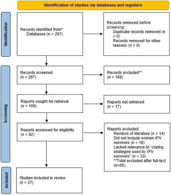 Among the 297 articles identified as relevant articles, two reviewers conducted a full-text assessment of 95 articles. After applying the inclusion and exclusion criteria, 65 articles were excluded for the following reasons: 14 were literature reviews, 18 did not focus on female IPV survivors, and 33 lacked relevant data about coping strategies. Ultimately, 27 studies met all eligibility criteria and were included in the scoping review. The screening process is shown in Figure 1.