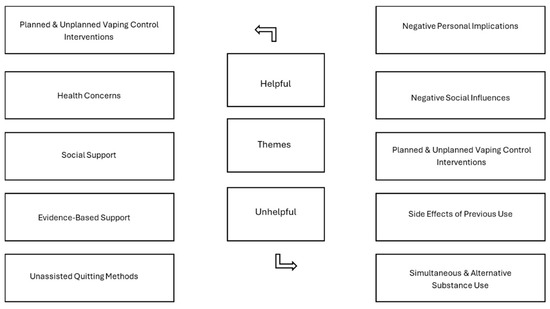 The theme planned and unplanned vaping control interventions was found in both the helpful and unhelpful participant responses. For the responses illustrating what was not helpful, it was coded 27 times. This code was used to capture sub-themes that included reflections on the change in government policies such as flavor bans (n = 8, 29.6%), nicotine caps (n = 3, 11.1%), and tax increases (n = 1, 3.7%). It also captured sub-themes regarding COVID-19 (n = 5, 18.5%), financial implications (n = 1, 3.7%), and access to products (n = 9, 33.3%).