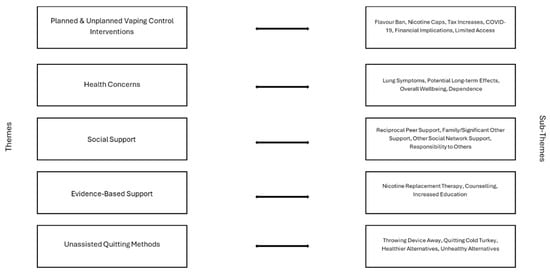 When participants were asked to reflect on what was helpful in supporting them while quitting vaping, five themes and twenty-one sub-themes were identified (see Figure 1 for themes; see Figure 2 for sub-themes). Across the two age groups, the themes were consistent: planned and unplanned vaping control interventions (n = 48, 21%), health concerns (n = 41, 18%), social support (n = 71, 30%), evidence-based support (n = 16, 7%), and unassisted quitting methods (n = 57, 24%).