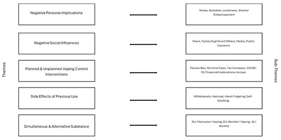 Participants were asked to share what was not supportive to them in their efforts to quit vaping. After the analysis, there were five themes identified and twenty-one sub-themes. The themes are identical across both age categories. The themes include negative personal implications (n = 27, 13%), negative social influences (n = 131, 63%), planned and unplanned vaping control interventions (n = 27, 13%), side effects of previous use (n = 8, 4%), and simultaneous and alternative substance use (n = 15, 7%). (See Figure 1 for themes; see Figure 3 for sub-themes.)