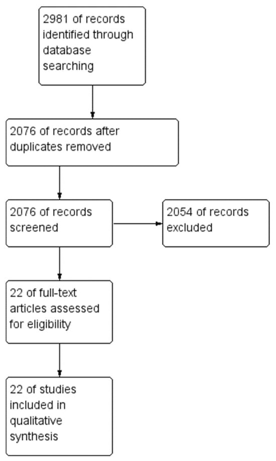 The literature search was conducted on the 5 March 2025. The following databases were searched: Medline (all years), Embase (all years), and PsycINFO (all years). The search returned 2981 records, among which 905 were duplicates. The remaining 2076 were screened by title and abstract for relevance. A total of 22 articles were deemed relevant and were included in this review (see Figure 1). Articles were chosen by the senior author (AB) and confirmed and checked by the second (SG) to ensure they are relevant to the meta-synthesis and the validity of the reflexive interpretation of themes and concepts. No further methods to identify studies were conducted. Rayyan [] was used to manage the literature search and review.