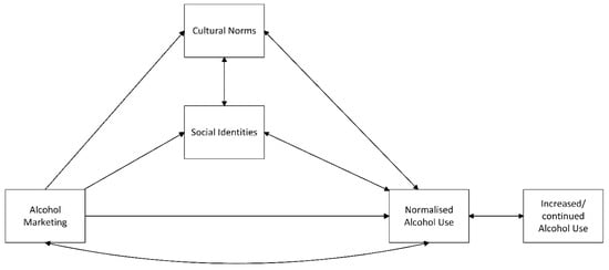 In conclusion, alcohol content in the media exhibits a strong social pull to engage in behaviours. Young people often perceive alcohol use as a normalised behaviour based on social norms and their identities. Alcohol marketing often uses identity-based marketing, advertising products using aspirational, fun, or gendered messaging which links certain brands to social identities of consumers in society. Young people then behave in line with their social identities, consuming alcohol or certain brands as a perceived group norm, further perpetuating the link between alcohol and social identities. The normalisation of alcohol consumption through social media, the strategic use of branding to shape identities, peer influence, and the targeted marketing tactics of alcohol brands all contribute to the embedding of alcohol use in youth culture. These themes demonstrate how marketing practices are not only designed to promote alcohol but also target demographics and identities to shape social norms and behaviours, particularly among young people who are navigating their identities in both digital and physical spaces. The pervasive presence of alcohol in media, coupled with peer and social pressures, creates an environment where drinking is seen as an integral part of social life, with significant implications for young people’s health and well-being. Whilst a relationship exists between alcohol marketing and consumption, this review goes beyond exposure-based explanations by positing that alcohol content and marketing are often targeted at young people and work through social identities and cultural norms to normalise alcohol use and lead to increased consumption through embedding content and marketing in culture; this normalised use leads to more exposure to content and marketing in society (see Figure 2).