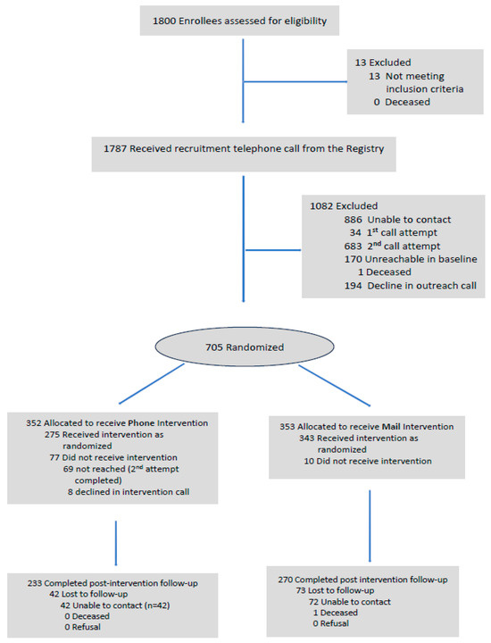 A total of 1800 enrollees were assessed for eligibility and 1787 received a recruitment telephone call. Of those receiving a call, 1082 enrollees could not be contacted; 705 enrollees consented to participate in the study (Figure 1). Due to a programming error in the assignment of enrollees to interventions, the brochure and phone call groups developed a temporary imbalance. This was corrected by assigning 68 consecutively consented enrollees to the brochure group.