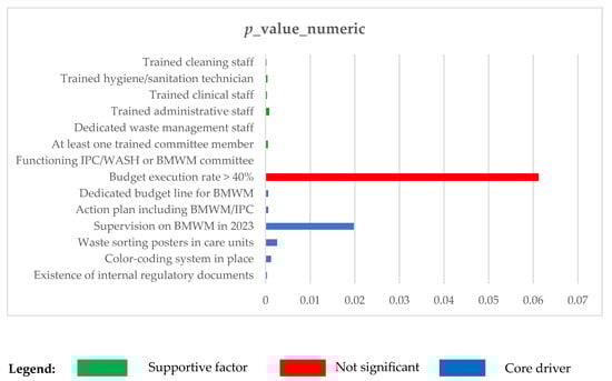 The results presented in Table 4 show that several governance indicators are statistically associated with biomedical waste management (BMWM) quality. However, they do not all have the same explanatory weight. In order to guide operational recommendations, we distinguish here the “key factors” strongly associated with the performance of “supporting factors”, which strengthen the institutional environment but have an indirect effect. Figure 3, based on the analysis of numerical p-values, shows the governance criteria and the different degrees of association with the quality of waste management.