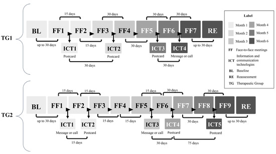 The group-based nutrition interventions for both TG1 and TG2 lasted for six months and included 60-min face-to-face meetings in PAS units and ICT strategies aimed at promoting continued reflection on meeting topics and motivating adherence [7]. The schedule for TG1 included 7 face-to-face meetings and 4 ICT strategies, with the aim of reaching 3% body weight reduction. For TG2, 9 face-to-face meetings and 5 ICT activities were delivered, with the goal of reaching 5% body weight reduction, reflecting a higher level of intervention intensity and the seriousness of the condition of obesity.