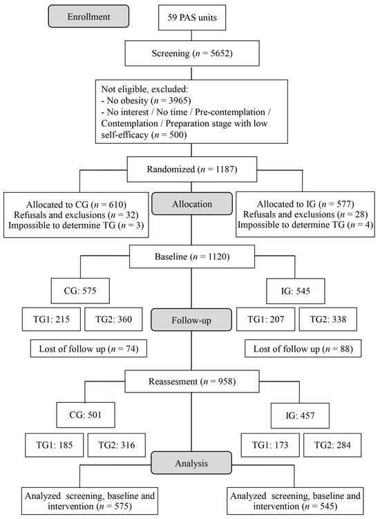 We evaluated 5652 users in the 59 PAS units. Of these, 3965 were not obese, and 500 were not prepared to treat obesity, according to the Transtheoretical Model, or were interested in participating in groups. So, 1187 were eligible to participate in the group-based nutrition interventions. After refusals and exclusions (n = 60) and impossible to determine the TG (n = 7), 1120 users were allocated in the groups, according to Figure 1, being 422 in TG1 and 698 in TG2. The reassessment was carried out with 958 participants because of the loss of follow-up (CG = 74; IG = 88), so a total of 358 from TG1 and 600 from TG2 were evaluated (Figure 3).