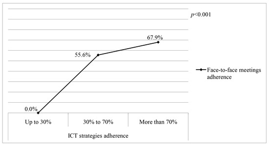 The median total adherence to the intervention was 52.4% (26.8–70.2), which was different between the TGs [TG1 = 47.8% (23.8–64.9) and TG2 = 56.9% (31.1–71.5); p = 0.002]. When considering face-to-face meetings, the median adherence was 45.7% (14.3–73.5), without difference between the groups [TG1 = 44.9% (14.3–71.4) and TG2 = 55.6% (11.1–77.8); p = 0.184]. The ICT strategies had a median adherence of 56.3% (31.2–80.0), with a difference between the groups [TG1 = 56.3% (25.0–56.3) and TG2 = 60.0% (40.0–80.0); p < 0.001]. Adherence to face-to-face meetings was associated with ICT strategies; the higher the adherence to ICT strategies (more than 70% vs. 30% to 70%), the higher the adherence to face-to-face meetings (67.9% vs. 55.6%) (p < 0.001) (Figure 4).