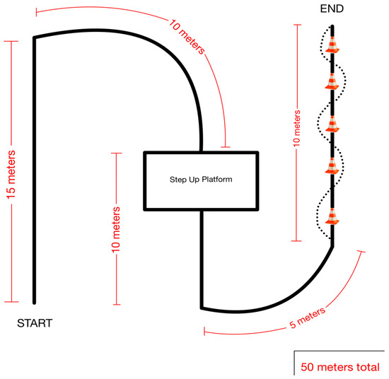 Participants of the study then completed three trials (two-wheeled walker, standard cane, and a deviceless control trial) where they navigated a 50 m course (Figure 1). The course consisted of straightaways, turns, platform negotiation, and a five-cone weave. The three trials were completed in a random order of (1) walker–cane–no device, (2) walker–no device–cane, (3) cane–no device–walker, (4) cane–walker–no device, (5) no device–cane–walker, or (6) no device–walker–cane. Each trial was video recorded to be analyzed for actual step count.