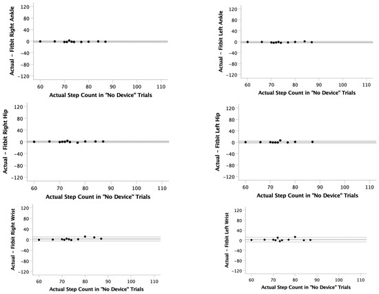 Bland–Altman plots for the “No Device” trials. The actual step count was recorded via video and compared to the step count recorded on 6 Fitbits (right ankle, left ankle, right hip, left hip, right wrist, and left wrist). Limits of agreement (LOA) were calculated as LOA = mean observed difference ± 1.96 × standard deviation of observed differences.