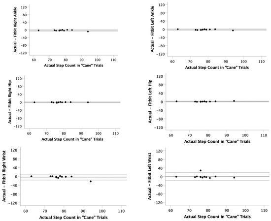 Bland–Altman plots for the “Cane” trials. The actual step count was recorded via video and compared to the step count recorded on 6 Fitbits (right ankle, left ankle, right hip, left hip, right wrist, left wrist). Limits of agreement (LOA) were calculated as LOA = mean observed difference ± 1.96 × standard deviation of observed differences.