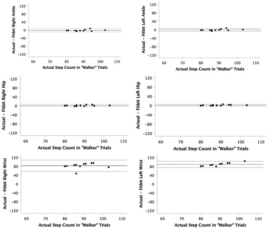Bland–Altman plots for the “Walker” trials. The actual step count was recorded via video and compared to the step count recorded on 6 Fitbits (right ankle, left ankle, right hip, left hip, right wrist, left wrist). Limits of agreement (LOA) were calculated as LOA = mean observed difference ± 1.96 × standard deviation of observed differences.