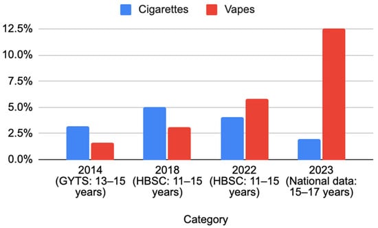 As illustrated in Figure 1, in 2014, according to the GYTS, 3.2% of adolescents aged 13–15 were current cigarette users, while only 1.6% used vapes []. It is important to note that the data presented in Figure 1 are drawn from different studies, which limits the direct comparability of these figures. According to the GYTS Indicator Definitions, “current use” refers to the number of respondents who had smoked cigarettes or any other smoked tobacco products in the past 30 days []. By 2018, data from the HBSC study showed an increase in both categories among 11 to 15-year-olds, with 5% smoking cigarettes and 3.1% using vapes. However, in 2022, the trend began to shift. While cigarette use slightly declined to 4.1%, vape use saw a sharp increase to 5.8%. By 2023, national data for older adolescents (15–17 years) revealed a dramatic change. Regular cigarette use had dropped to 2%, marking the lowest rate in the observed period. In contrast, vape usage had surged to 12.5%, indicating a growing preference for e-cigarettes over traditional tobacco.