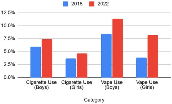 Figure 2 shows that, according to the HBSC 2018 and 2022 reports, between 2018 and 2022, both current cigarette and vape use among boys and girls tended to increase in Kazakhstan, but the magnitude of increase was significantly greater for vaping [,]. Cigarette smoking experience among boys increased by 1.5% (from 5.9% to 7.4%), and it increased by 0.9% for girls (from 3.7% to 4.6%). In contrast, vaping experience rose by 2.9% among boys (from 8.4% to 11.3%), whereas the increase among girls was more pronounced, more than doubling from 3.8% to 8.2%. These trends highlight a sharper rise in vaping than in cigarette smoking, especially among girls, indicating a shift in nicotine consumption preferences among adolescents.