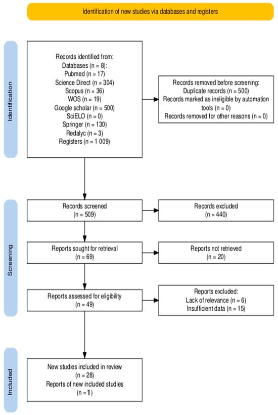 A total of 1009 records were identified from the various search sources. After removing 500 duplicates, 509 records remained for screening. Based on title and abstract review, 440 of these were excluded, leaving 69 reports for full-text retrieval. An additional 20 reports could not be retrieved, which left 49 articles to be assessed for eligibility. From these, a further 21 reports were excluded after full-text analysis (15 due to insufficient data and 6 for lack of relevance). This process resulted in 28 studies being included from the database search. Additionally, one eligible study was identified using another method by reviewing the reference lists of included articles. Thus, a total of 29 studies were included in the final review (see Figure 1).
