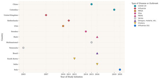 Regarding the diseases studied, respiratory and viral illnesses clearly predominate, especially COVID-19 and influenza, due to their epidemiological significance. The timeframe of data collection is considerable, spanning from early studies on dengue starting in 2003 [] to recent research focused on COVID-19 [,,]. The urgency of sudden outbreaks like COVID-19 or Zika often leads to studies with limited timeframes, whereas influenza research typically analyzes data across multiple seasons. Beyond the main respiratory viruses, other diseases such as Zika, MRSA, MERS, dengue, and cholera have also been examined. Broad studies like Feldman et al. [], which covers multiple pathologies, validate the general applicability of these methodologies.