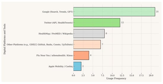 The analysis of the 29 included studies reveals a digital ecosystem dominated by two primary types of data sources, including public web search engines and social media platforms, as detailed in Table 2 and visually summarized in Figure 3. Search engines, predominantly Google (used in 20 studies), offer high-volume, query-based data that are effective for tracking general interest in diseases like influenza or COVID-19. In contrast, social media platforms like X (12 studies) and Weibo provide richer, albeit noisier, contextual data, often used to analyze symptom self-reporting and public sentiment. A notable trend is the combination of these sources within a single study, a strategy used to balance the breadth of search data with the depth of social media content, as seen in the work of McGough et al. [] and Santillana et al. []