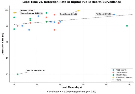 Studies on digital public health surveillance stand out for a remarkable methodological diversity, reflecting an evolution toward more sophisticated approaches. As shown in Table 1, the research includes quantitative comparative empirical analyses (e.g., []), observational studies [], retrospective and cohort analyses [], as well as exploratory studies []. This variety demonstrates how statistical and modeling techniques have progressively adapted to the growing availability of digital data, incorporating advanced methods to improve outbreak prediction and management.