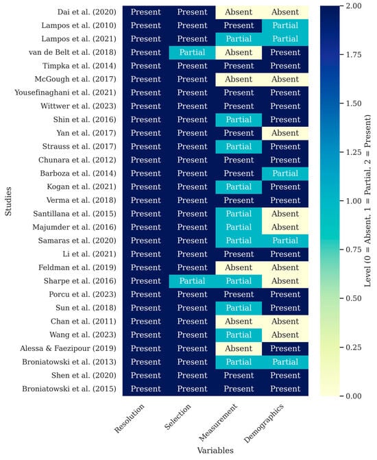 A descriptive statistical analysis, including frequency counts and distributions of the extracted variables, was conducted using R software (version 4.3.0; accessed 15 March 2025). Foundational charts and plots were generated using R’s ggplot2 library, while more complex and customized visualizations, such as matrices and heatmaps, were created with Python’s matplotlib library (version 3.8.2; accessed 9 April 2025). Napkin (beta version; accessed 6 June 2025; https://www.napkin.ai/) was also used to create schematic and process diagrams.