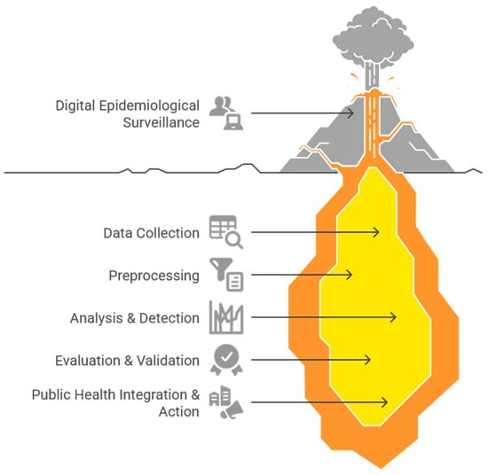 - Shakeri Hossein Abad, Z.; Kline, A.; Sultana, M.; Noaeen, M.; Nurmambetova, E.; Lucini, F.; Al-Jefri, M.; Lee, J. Digital Public Health Surveillance: A Systematic Scoping Review. NPJ Digit. Med. 2021, 4, 41. [Google Scholar] [CrossRef]