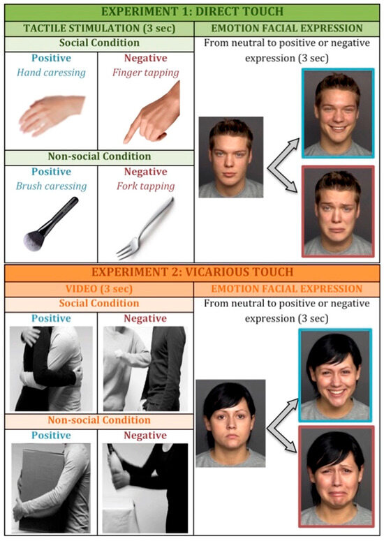 - Ellingsen, D.-M.; Wessberg, J.; Chelnokova, O.; Olausson, H.; Laeng, B.; Leknes, S. In Touch with Your Emotions: Oxytocin and Touch Change Social Impressions While Others’ Facial Expressions Can Alter Touch. Psychoneuroendocrinology 2014, 39, 11–20. [Google Scholar] [CrossRef]