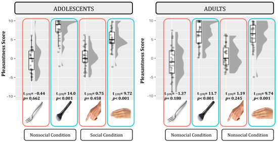 Pleasantness scores for each tactile stimulation in adolescents (left panel) and adults (right panel). Plots illustrate the central value (horizontal line), interquartile range (upper and lower limits of the boxes), individual scores (single points), and distribution of the data points (grey profile) for both positive (blue) and negative (red) tactile stimuli; n participants = 60; n observations = 240.