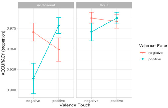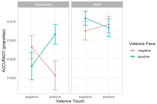 To analyze participants’ accuracy in recognizing emotion facial expression, we compared a set of nine nested mixed-effect models as described in Statistical Analyses section. According to the likelihood ratio test, the best fitting model was model 5 (AIC = 549.4, ΔAIC = 6.73, wAIC = 0.34 χ2 = 12.73, p = 0.005; for details on model comparison see Table S3 in Supplementary Materials). The ANOVA on model 5 reveals the main effect of Touch valence (χ2 = 4.42, p = 0.036) and an interaction effect between Face valence and Touch valence (χ2 = 10.36, p = 0.001), suggesting that participants are more accurate in recognizing the valence of facial expression when preceded by congruent tactile information. Importantly, a three-way interaction between Age group, Face valence, and Touch valence (χ2 = 9.01, p = 0.002) emerged. Post hoc analysis shows that the interaction between Face valence and Touch valence was significant in the adolescent group (F = 10.36, p = 0.001) but not in the adult group (F = 1.03, p = 0.310; Figure 3; for details on the best model, ANOVA, and post hoc test, see Table S4 and Figure S2 in Supplementary Materials).
