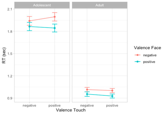 To analyze participants’ speed in evaluating emotion expressions, we compared a set of models including the same factors used to analyze accuracy scores. According to the likelihood ratio test, the best fitting model was model 5 (AIC = 928.5, ΔAIC = 4.41, wAIC = 0.64, χ2 = 6.41, p = 0.011; for details on model comparison see Table S5 in Supplementary Materials). The ANOVA on model 5 reveals the main effect of Age group (χ2 = 45.29, p < 0.001), indicating that adults (mean RT = 0.974 s, sd = 0.440) were faster than adolescents (mean RT = 1.910 s, sd = 0.837) in providing a response to facial expressions. Additionally, a main effect of Face valence emerged (χ2 = 9.86, p = 0.002), suggesting that, overall, participants were faster in responding to positive compared to negative facial expressions. This effect seems to be stronger in adult participants compared to adolescents, as indicated by the interaction effect between Age group and Face valence that emerged (χ2 = 6.42, p = 0.011) and by post hoc contrasts revealing that in both groups of participants, the effect of Face valence was significant, although with different effect size (adolescents: F = 9.86, p = 0.002; adults: F = 20.16, p < 0.001, Figure 4; for details on the best model, ANOVA, and post hoc test, see Table S6 and Figure S3 in Supplementary Materials).